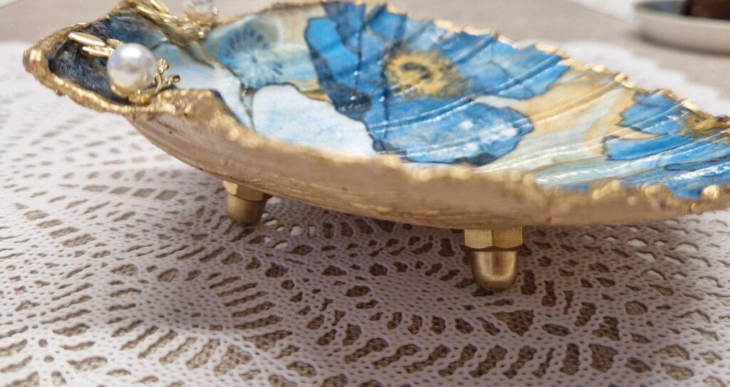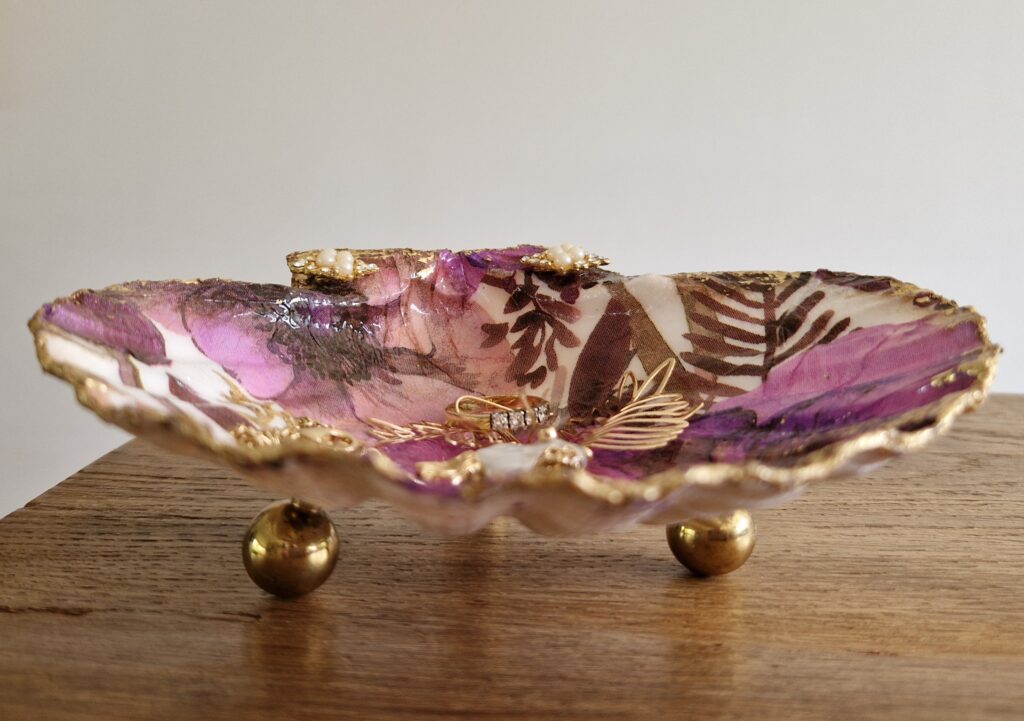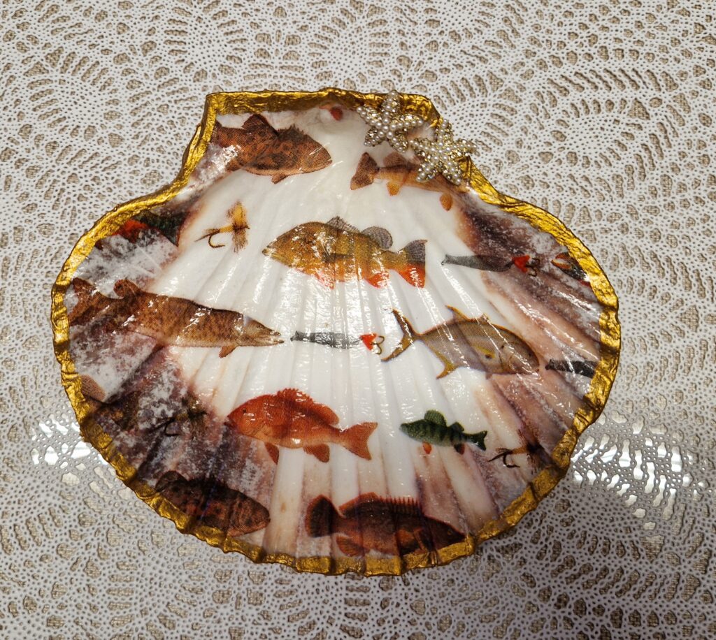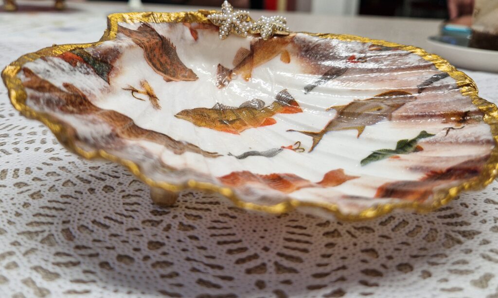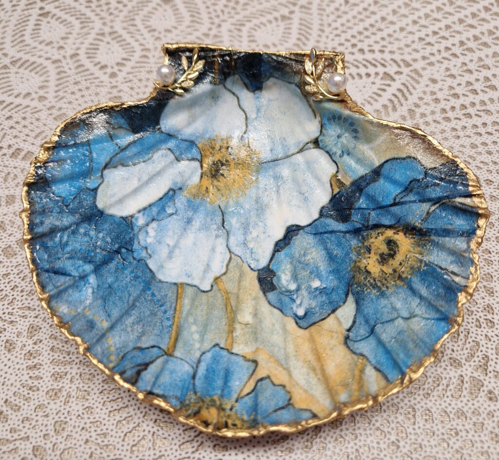 De St.Jacobsschelp is een waaiervormige crème/witte schelp met een rozige/bruine rand. (ook wel een coquille genoemd) De schelp is een symbool van de heilige Jacobus de Meerdere en de pelgrimsroute naar Santiago de Compostela. De schelp wordt vaak gebruikt voor decoratie , voor het serveren van gerechten of sieraden en edelstenen in te leggen. De schelp decoreer je door te schilderen en/of met de Decoupage techniek. Met servetten en lijm/lak, goudfolie en goudverf ga je aan de slag en creëer je je eigen persoonlijke sieradenschaaltje, amberblokje-schaaltje of een pronkstuk op de tafel of kast. Maak dit unieke en persoonlijke pronkstuk voor jezelf maar zeker ook leuk om weg te geven aan je vriendin, (schoon)moeder, zus of wie dan ook! Je kunt de schelpen ook versieren met een sieraad, steentjes of parels. Met deze materialen maak je op een leuke manier een unieke creatie om een persoonlijk tintje aan je interieur te geven of een lief mens te verrassen.